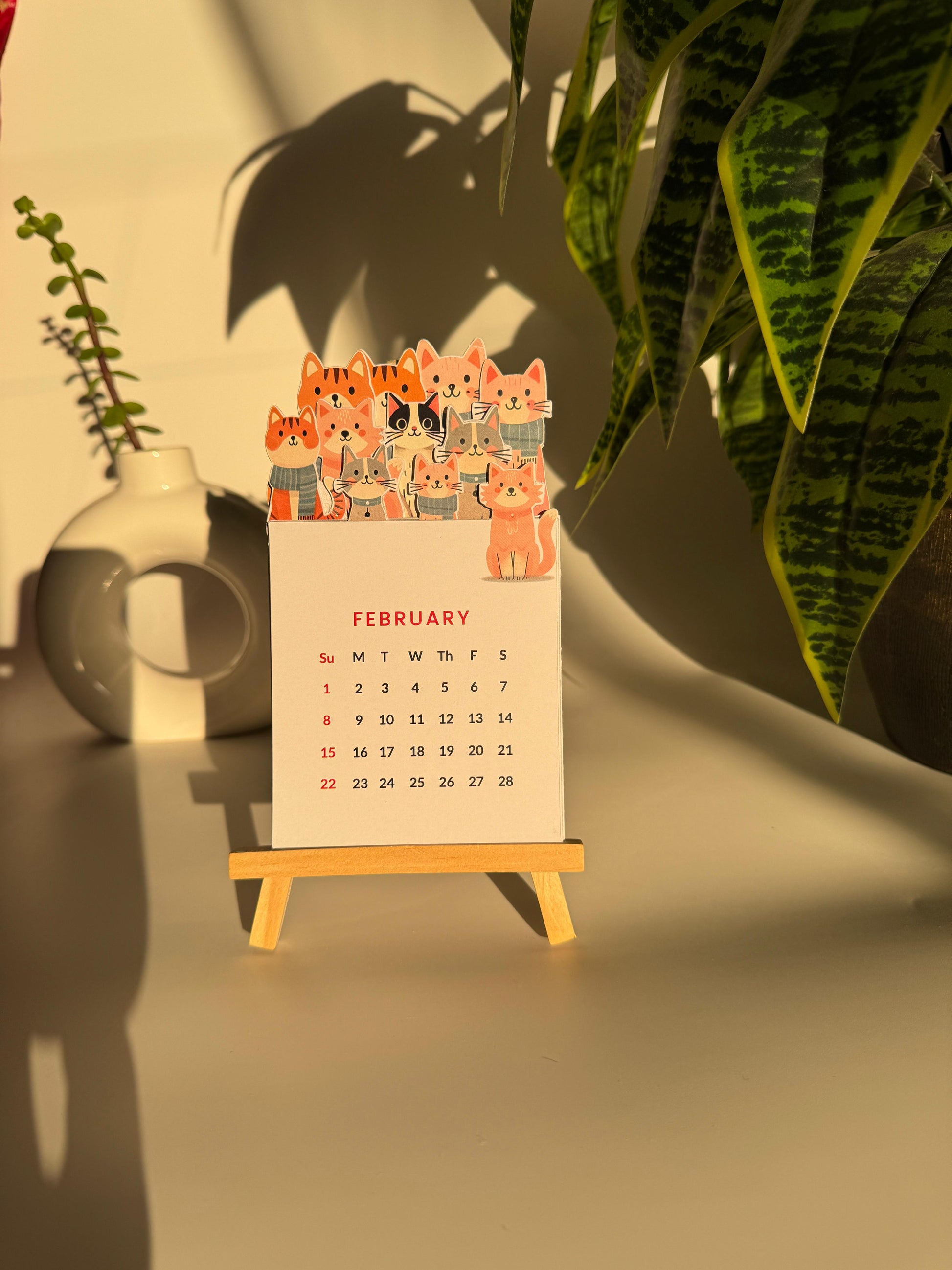 2026 Cat Calendar with Wooden Stand – Minimal & Aesthetic Office Decor